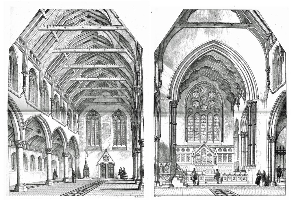 Though Heller was fond of Pugin, Holy Trinity and St. John’s both were designed in an early English, lanceted style reflecting the Ecclesiastical Society’s preference for late 12th and early 13th century churches as an appropriate model for contemporary Britain.