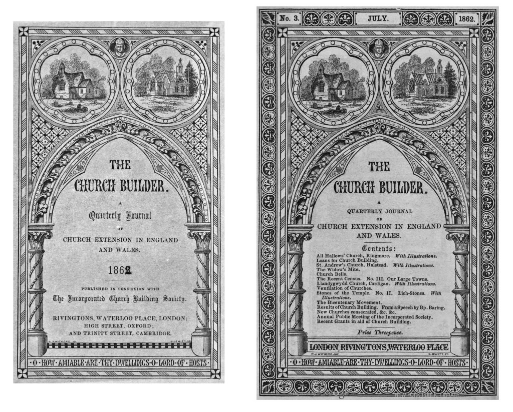 As Withers was showing that he could design in the most current fashions, the main part of his architectural practice was still based in the Ecclesiastical Society and in designing churches, schools, rectories and parsonages for the Episcopal Church. It was perhaps because of that unwavering devotion that he was asked to design the cover of The Church Builder, a quarterly journal published in connection with the Incorporated Church Building Society. Wither designed two slightly different title pages which were used in every issue for almost twenty years beginning with the magazine’s first issue in 1862.