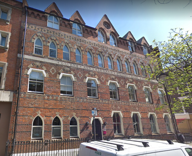 The two-story building located at the corner of Wellington and Exeter Streets in London was intended to have a more industrial feel. This was designed to one building with two purposes. The two story building on the corner held office/ retail space while the adjacent four story section was simpler and more industrial since it was intended for printing presses. By using rounded rather than pointed arches, Withers was able to increase the size of the windows, allowing for much more natural lighting and views into the building from the street. This yellow brick building exhibited restrained polychromy with with its accents of red bricks and stone mouldings. Before the mansard roof was added, the building had a parapet topped with urns at each angle.