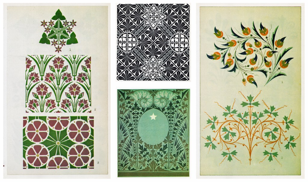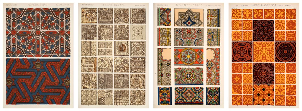 Besides Ruskin, England also had Owen Jones (1809-1874) who, it can easily be argued, had an overall far greater impact than Ruskin in matters of design. Jones was a pioneer in too many fields to cover in this blog, but he would be instrumental in creating the intellectual foundations for both Pugin and Ruskin as early as 1835. Between 1836 and and 1842, he published Plans, Elevations, Sections, and Details of the Alhambra, the illustrations for which the printing process of chromo-lithography was invented. In 1851, Jones and Henry Cole were the driving forces behind the colors and displays of the Chrystal Palace in Hyde Park, the first World’s Fair. Suddenly, Britain had the entire world at its doorstep. With the success of the World’s Fair, Jones was tasked to create an encyclopaedia of design entitled The Grammar of Ornament as a textbook for the South Kensington School which was formed out of the profits generated by the Chrystal Palace. This immediately became the reference for artist, architects and designers and created a sophisticated understanding of color that continues to have timeless relevance.