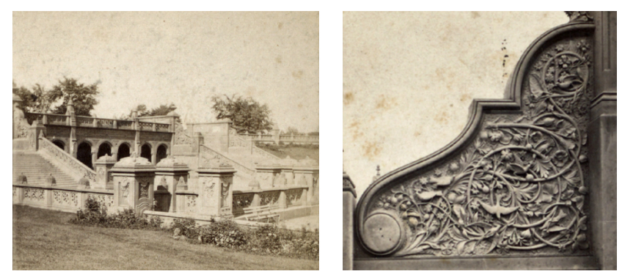 Though bridges and buildings would be constructed throughout the park, it was at the mall and terrace where Vaux and Mould created a sculptural program based on three-dimensional depictions of scenes found in nature that would have long-term impact not only on later landscape architecture, but also on designs for domestic, ecclesiastical and commercial architectural features. What made these features so remarkable was not only their design, but also their execution. Though there were stone cutters and carvers in the United States, it was common for more important commissions to be carved in Europe and sent back to be installed. In order to execute the complex carvings at the terrace, James Whitehouse and Robert Ellin, who had recently immigrated from Scotland and England, respectively, were hired to carry out the sculptural panels designed by Mould. Both Whitehouse and Ellin would go on to be pioneers in the American wood and stone carving. Robert Ellin would later form a partnership with William Kitson and their firm quickly rose to prominence gaining some of the most prestigious commissions of the late nineteenth century. Both Olmsted and Vaux would continue to use his services throughout the remainder of their careers.