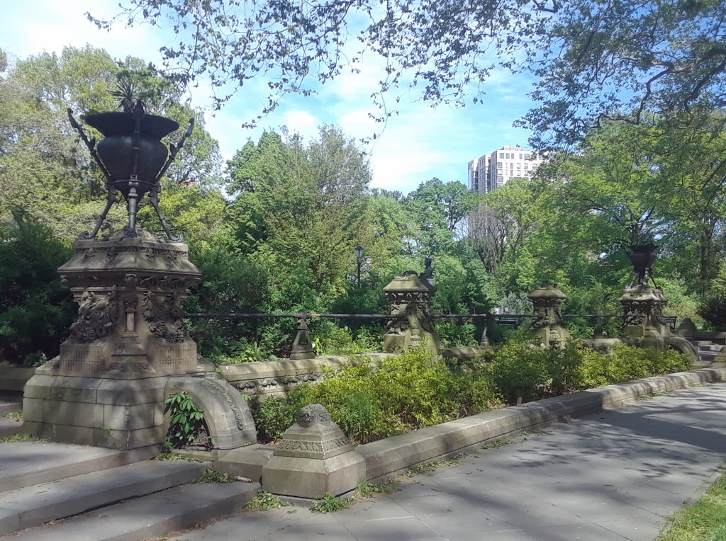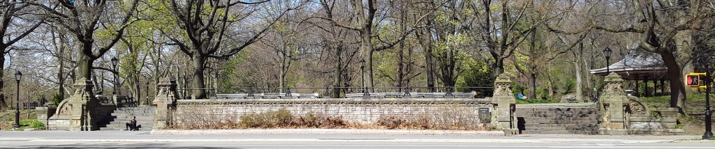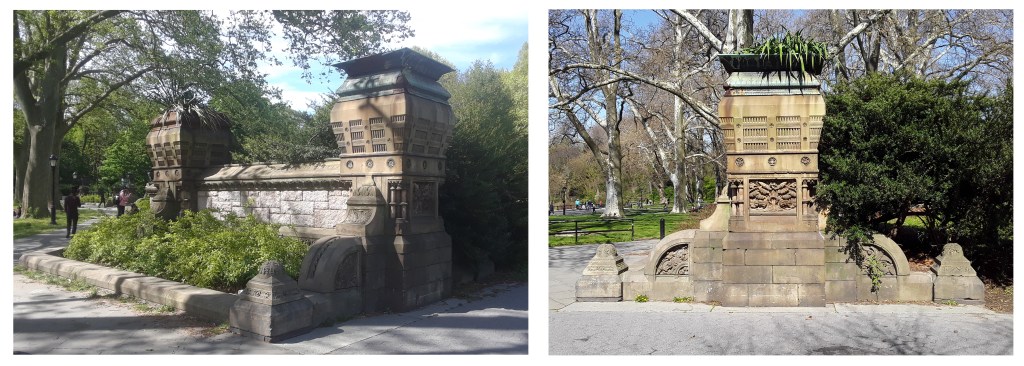 Just east of the circular planters was another entrance into the Concert Grove which also served as a viewing platform for parades along the concourse. This was designed with large piers similar to those at the esplanade, but here were much larger semicircular panels which had been designed by Thomas Wisedell. It is with those panels where it is most easily understood what he had learned from Jacob Wrey Mould in the Central Park Terrace.