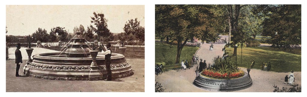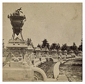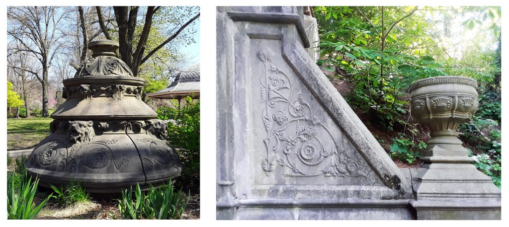 Behind the piers and planters, the terrace was divided by three walks leading to two, massive circular, granite planters centered by a fountain designed in a similar style. Like the other architectural features in the concert grove, these too were designed by Calvert Vaux while their detailing and ornamental work were designed by Thomas Wisedell, though the fountain may have had part of its decoration designed by Bassett Jones.