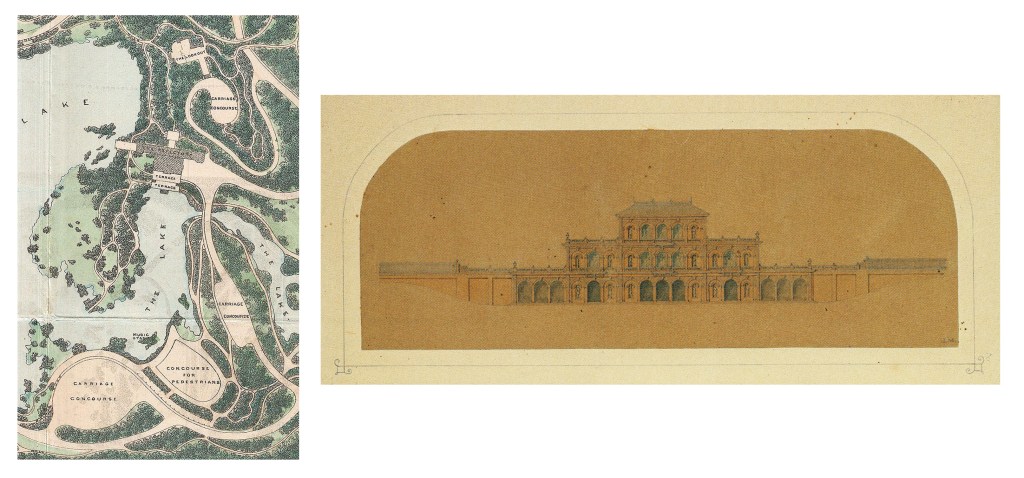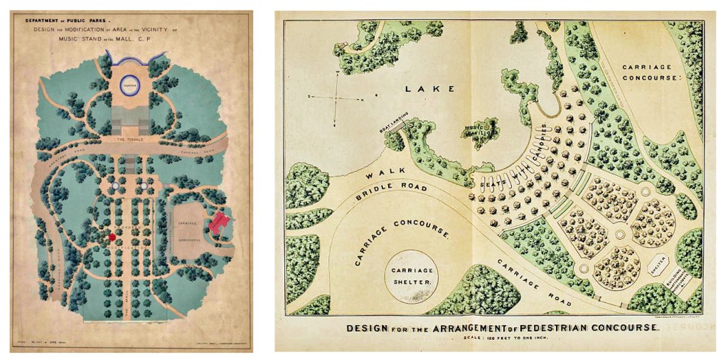 Right: Design of the pedestrian concourse at Prospect Park to become the “Concert Grove,” 1870.