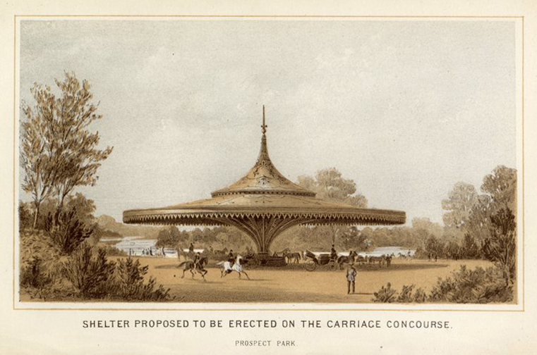 For the larger carriage concourse to the east, Vaux had designed a massive, circular carriage shelter with a large water trough for horses. The purpose of this was not only for those arriving at the Concert Grove, but also as a place where carriage rides could by purchased for traveling through the park. This unbuilt structure was one of the most daring pieces of engineering Vaux had attempted, measuring one hundred feet in diameter. Stylistically, it was quite similar to the Mineral Springs House (1867) in Central Park blending Safavid floral decoration with forms reflecting the northern reaches of the Ottoman empire.