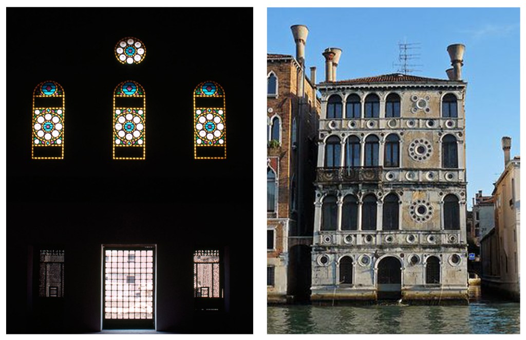 Note 2 — The architect and builder of Dario’s remodeling is usually attributed to Pietro Lombardo (ca. 1435-1515) since the same circular dials are also found on Santa Maria dei Miracoli (The Miracle Church) designed by Lombardo and constructed between 1481 and 1489.