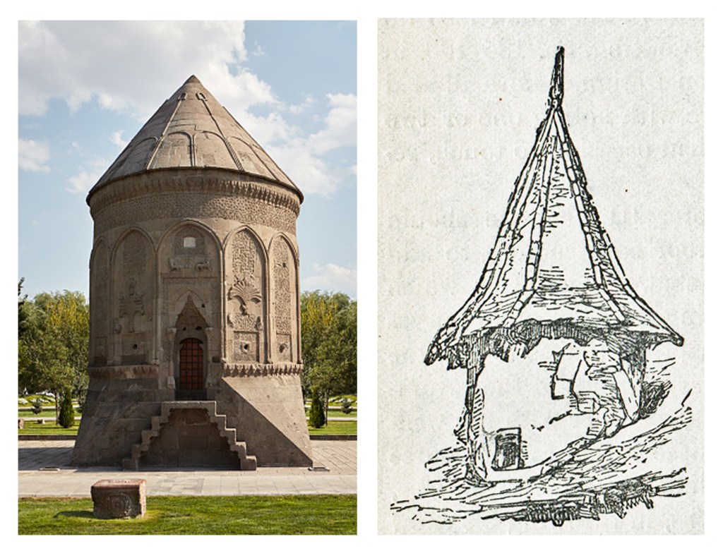Right: Figure XXXVII from Stones of Venice, vol. I. Example of conical roof originally developed in China