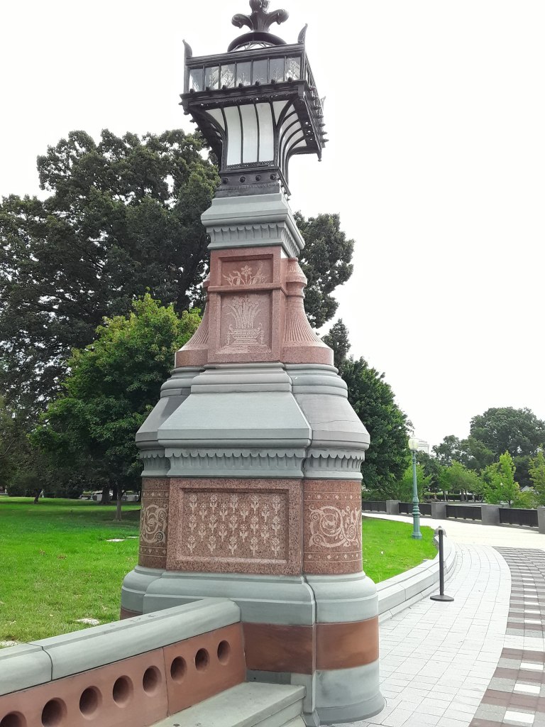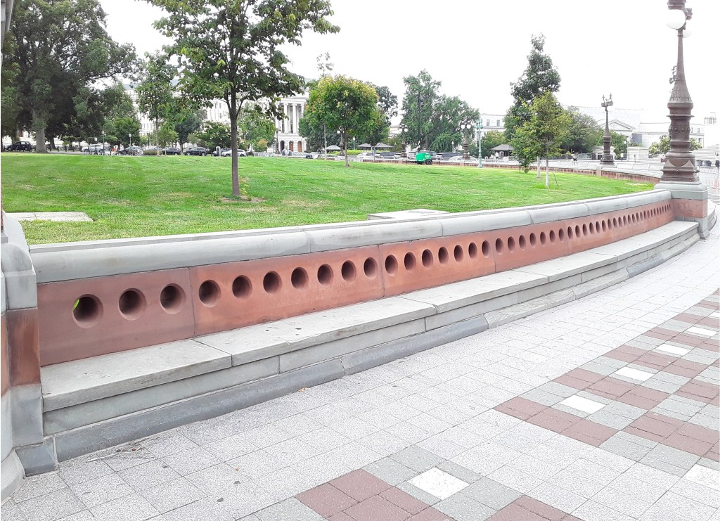Along with the fountains and lamp-piers, Thomas Wisedell had also designed two ranges of seated walls separating the plaza from the planted grounds, each running about 250 feet long and set in a semicircular manner facing the Capitol building. These were constructed of bluestone and red sandstone, with both materials also forming the bases for the bronze lamps as well as the granite lamp-piers.