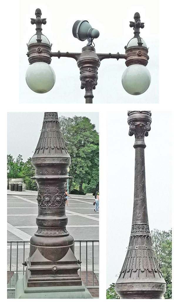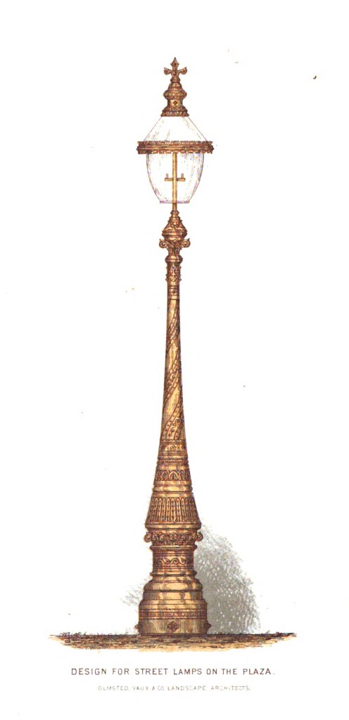 As for the sixteen bronze lamps, their designs incorporated Indo-Islamic and Native American motifs as well as contemporary ideas of Christopher Dresser. Thomas Wisedell had previously designed lamps for the oval plaza at the main entrance to Prospect Park as well the lamps at the base of the stairs in Washington Park in 1872 and 1873 respectively. Though those remained unbuilt, it does show that Wisedell’s experimentation in the Brooklyn parks would finally see their fruition at Washington. Like the iron work for other parks by Olmsted, the bronze lamps were cast by Janes & Kirtland of New York.