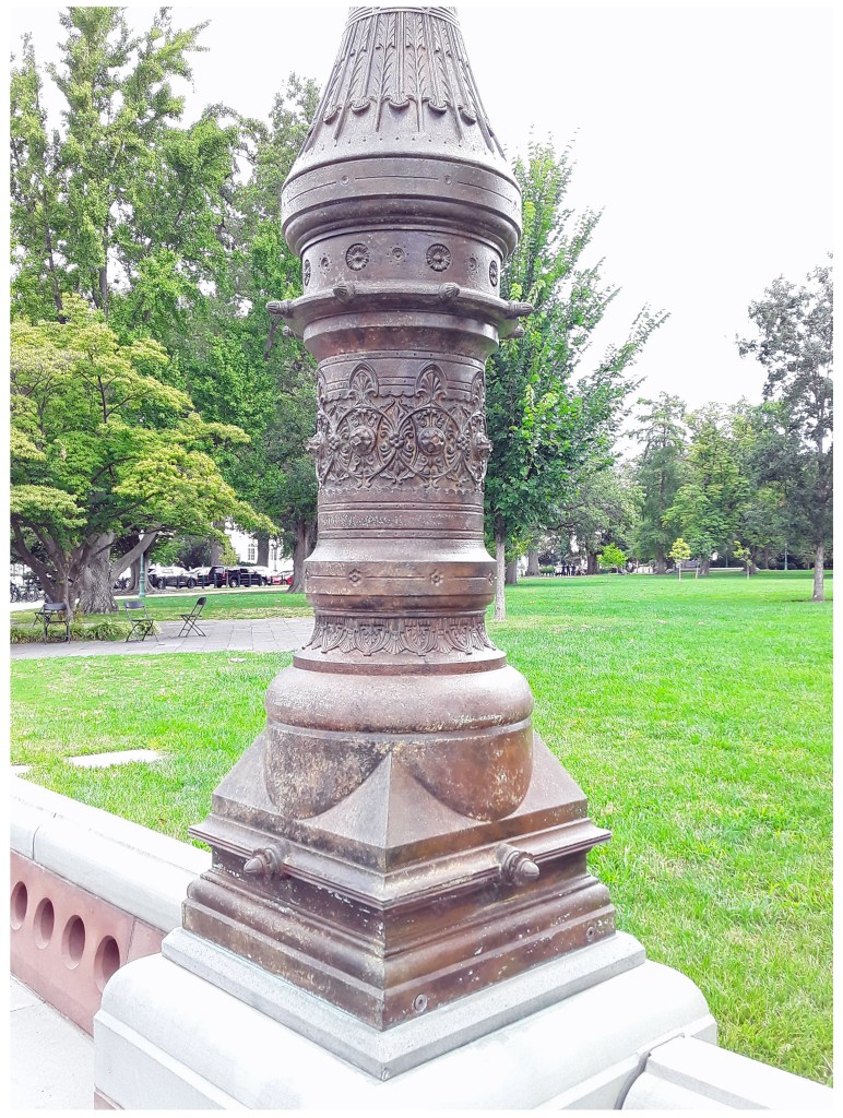 Like the rest of the east plaza the bronze lamp posts and stone seating were designed in July and August 1874. For the seating, the bluestone was used for the coping as well as the seats while softer, red Senaca sandstone was cut into large blocks pierced with holes cut 6 inches in diameter. Since the red sandstone was much softer than the bluestone, Wisedell rarely used it in a structural manner, though when he did, as in the bases of the lamp-piers, the stone had to be cut in much larger blocks in order to support to weight of the bluestone and granite which were cut into slabs rather than full blocks. Also, Wisedell set it between slabs or protected under a bluestone coping thus minimizing the effects that weathering and erosion.