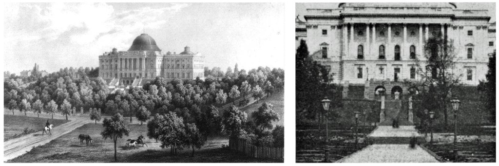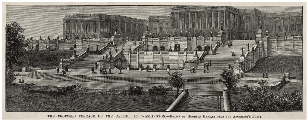 The need for an expanded terrace had become quite apparent following the erection of new house and senate wings in the 1850’s as well as the massive cast iron dome which had been completed in 1865. Besides those features, architect Thomas Ustick Walter had also planned a large expansion of the Library of Congress which at that time was housed in building’s western wing. Walter’s plans had called for for extending the library westward with a newly designed pedimented portico, echoing the main entrance on the east side. After consulting architects Thomas Ustick Walter and Edward Clark as well as engineer Montgomery Meigs, Olmsted tasked Thomas Wisedell’s with designing an expanded terrace that would accommodate that library expansion while properly anchoring the entire building to the edge of the hill without detracting aesthetically.