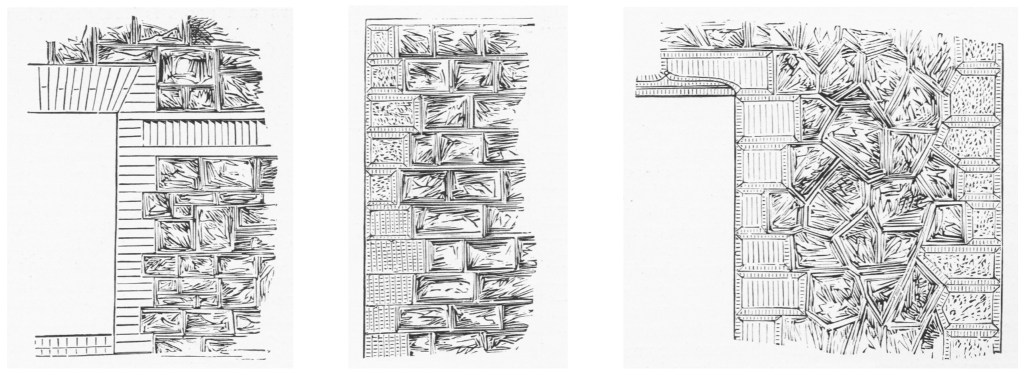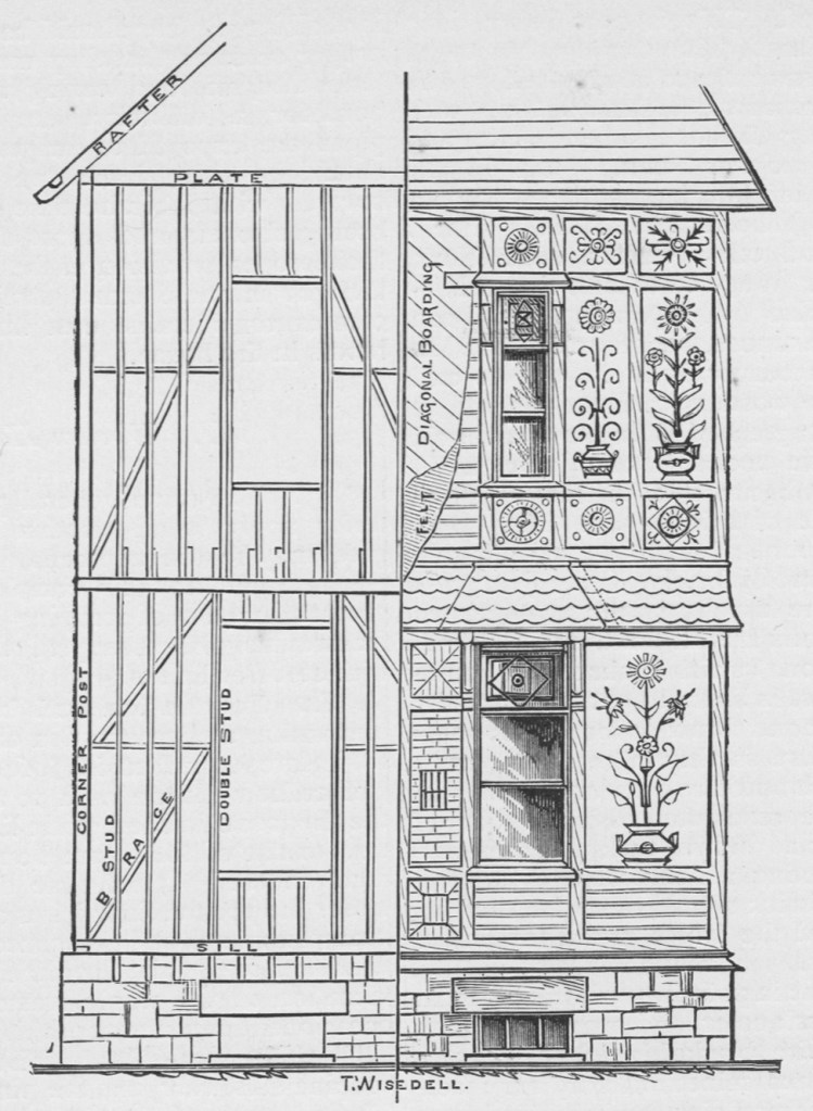 Part two of Wisedell’s writing on Construction focused on wood frame houses. Instead of hollow walls, Wisedell’s focus was on proper techniques for creating a structural frame. Most of the section was devoted to cladding and infilling. Besides clapboard and shingles, he also included ways of adding decorative elements through plaster and sgraffito, casting designs in cement or plaster, and using non-structural, decorative brick patterns as infill. He does note however, that most of those techniques were common in England but rarely attempted in the United States.