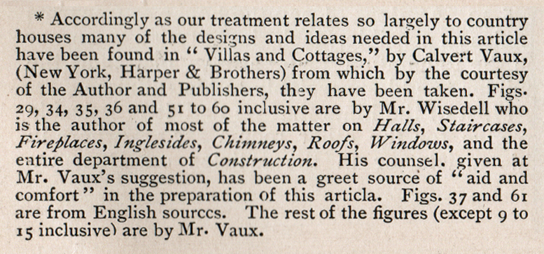 What probably led to the speculation that Calvert Vaux was its editor was that the section entitled “The House” was the largest single entry in the cyclopaedia with about forty-five illustrations being reprinted from his well-known and highly successful Villas and Cottages which was originally published in 1857 and had gone through numerous re-printings and editions, most recently re-released in 1874. (That book is still in print and ranks as one of the highest selling pattern books for houses in American history.) Vaux would have been well aware of the fact that most of the designs and illustrations from Villas and Cottages represented the early-mid 1850’s and were stylishly outdated, though much of its practical information was still quite relevant.