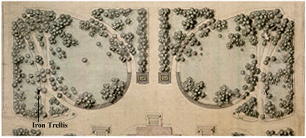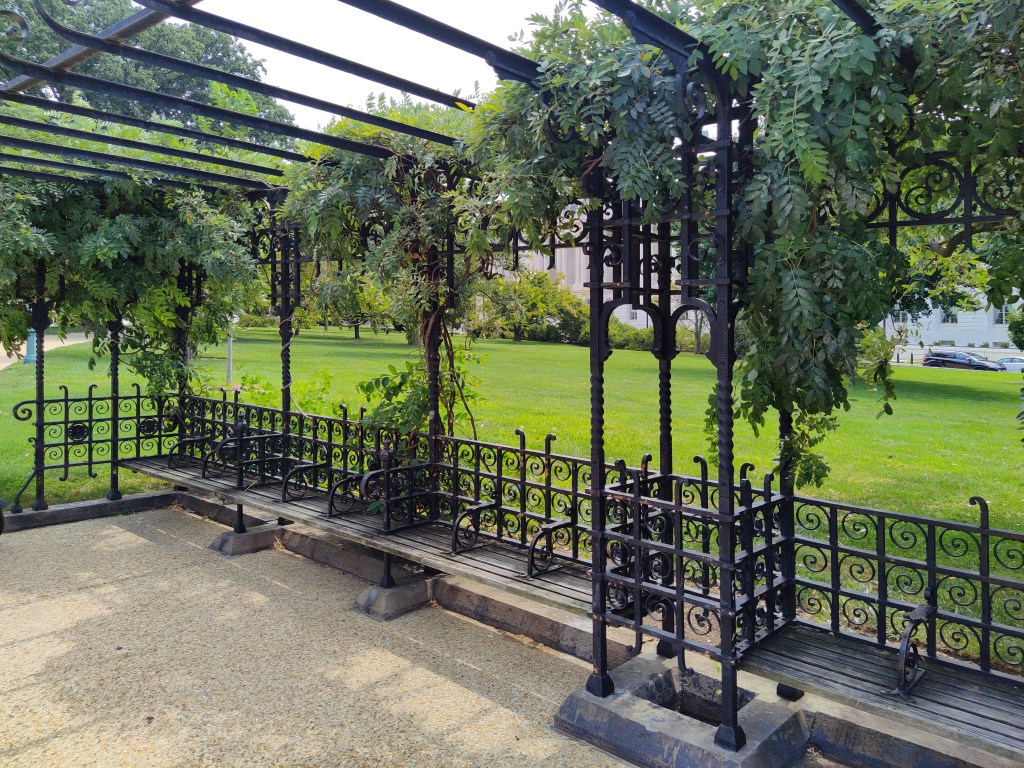 When Frederick Law Olmsted created his initial plan for the East Plaza in 1874, he had intended for a seated, iron trellis to be placed along one of the principle walks on the north side of the grounds, near the Delaware Avenue entrance. Like the waiting stations, a second trellis was erected in the same but opposite location on the south side of the grounds near the New Jersey Avenue entrance (marked A on the map).
