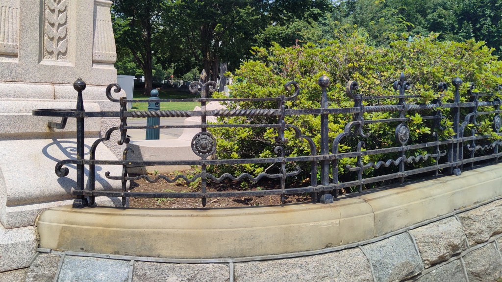 The seated trellises were probably designed in 1876 and have a slightly simpler use of the curly-cues with flatter, two-dimentional features giving a greater sense of geometric abstraction. Though the contractor was not specified in Olmsted’s reports, it was probably the Watson Manufacturing Company out of Patterson, New Jersey who supplied the cast and wrought iron parts as well as the rolled steel which was used for the actual trellis which supported a canopy of vines over the wooden seating.