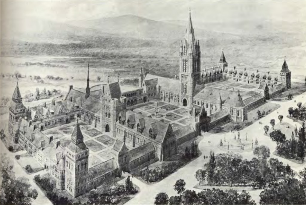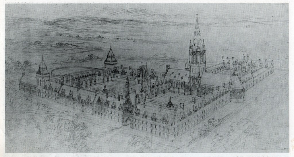 Jackson presented himself at Burges’ Buckingham Street office in London on August 1, 1872. During that initial meeting, Burges agreed to spend a day touring the various colleges at Oxford and advised Jackson to visit Cambridge as well. Burges also agreed to make a rough sketch of a campus at no charge which Jackson could take with him. After the two men returned from Oxford, Burges requested that Jackson return to London on September 2 when the they could spend two days going over the proposed college buildings. Over the next month, Jackson traveled around England and Scotland visiting various institutions. When Jackson returned to London to discuss some of the places he had visited, the two men came up with a general idea for the new campus.