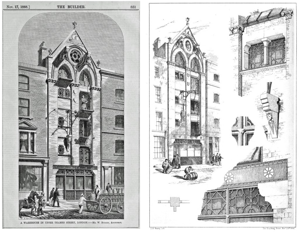 - “A Warehouse in Upper Thames Street, London, Mr. W. Burges, Architect,” The Builder 24 (Nov. 17, 1866): pl.